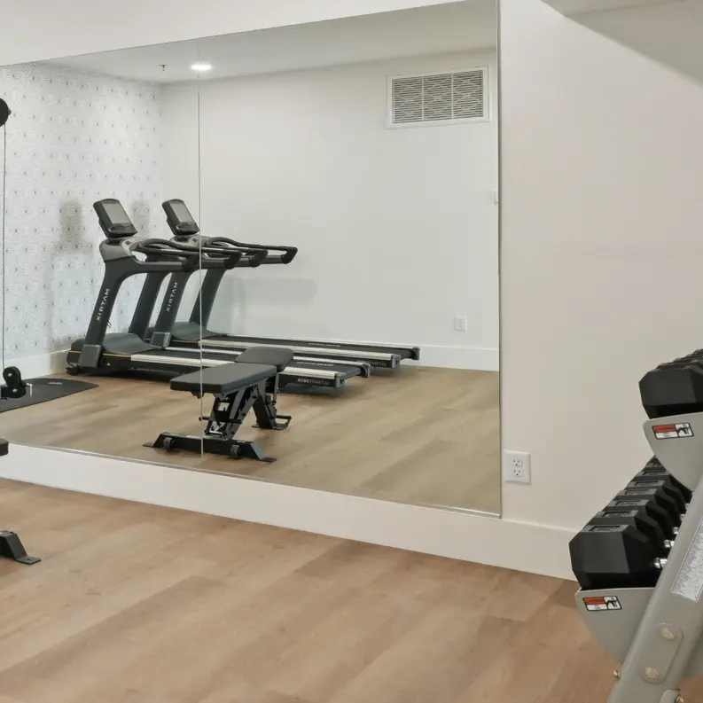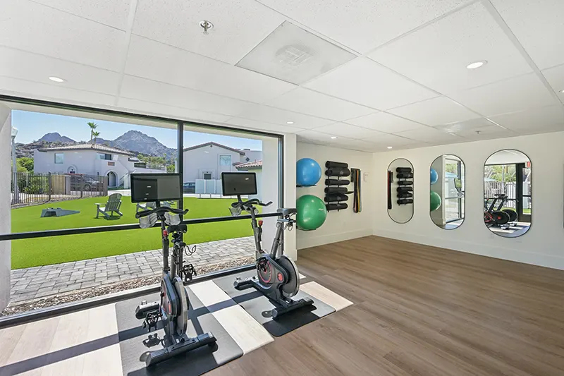 Train with modern cardio and spin equipment. The space is open, bright, and connected to the outdoors.